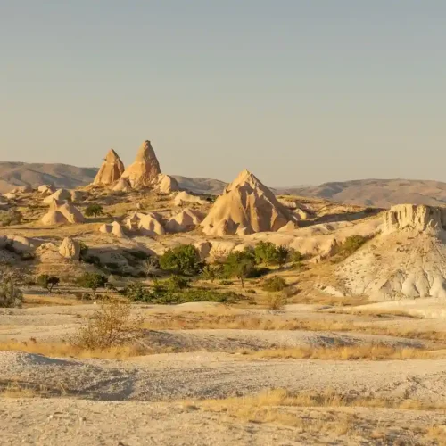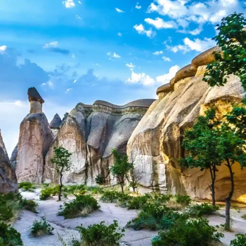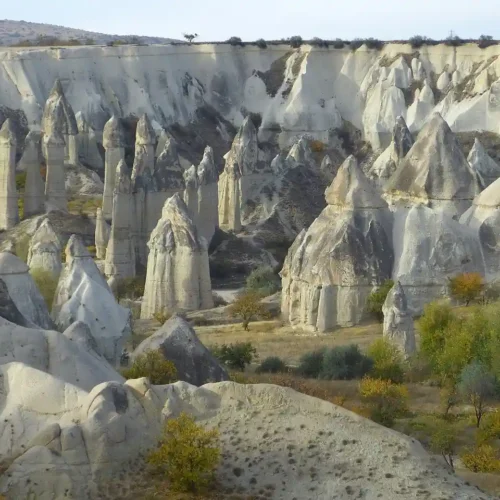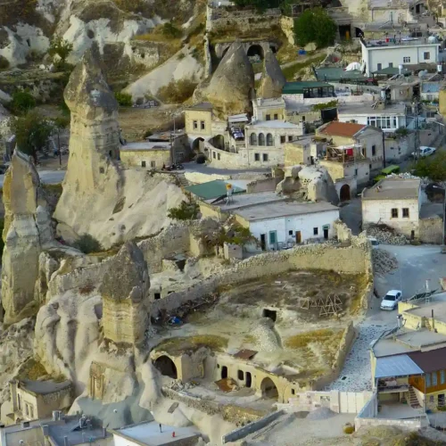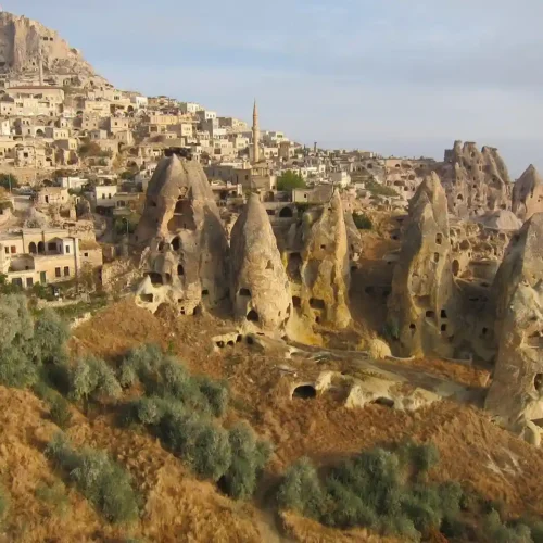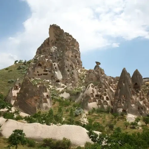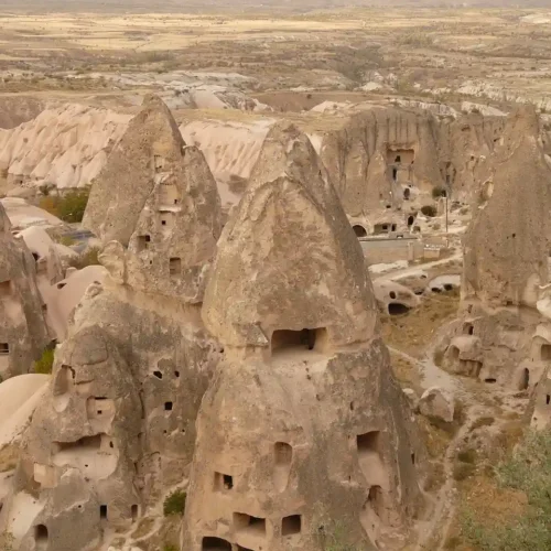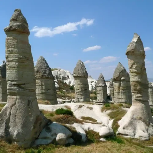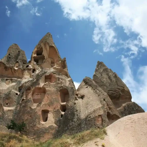 The rivers, flood water running down the hillsides of valleys and strong winds eroded the geological formations consisting of tuff on the plateau formed with tuff layers, thus creating bizarre shapes called fairy Chimneys. These take on the names of mushroom shaped, pinnacled, capped and conic shaped formations.