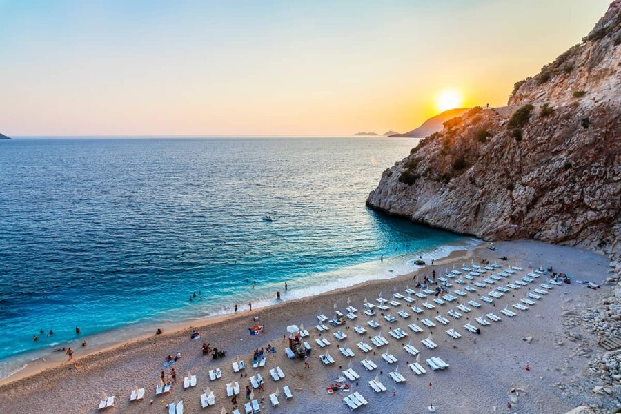 Known as one of the most photographed beaches in Türkiye, Kaputaş Beach is simply breathtaking. Nestled between steep cliffs, this beach is famous for its blonde sands and crystal-clear waters. You can reach it by descending a long staircase or by joining a boat trip from Kalkan or Kaş.