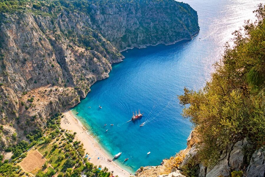 As its name suggests, Butterfly Valley is home to numerous butterfly species, but it’s also a haven for free-spirited travelers. This spectacular cove, surrounded by dramatic cliffs, is popular among campers, backpackers, and nature lovers. Accessible only by boat from Ölüdeniz or on foot via challenging hiking trails, the valley offers hidden waterfalls, white sands, and turquoise waters.